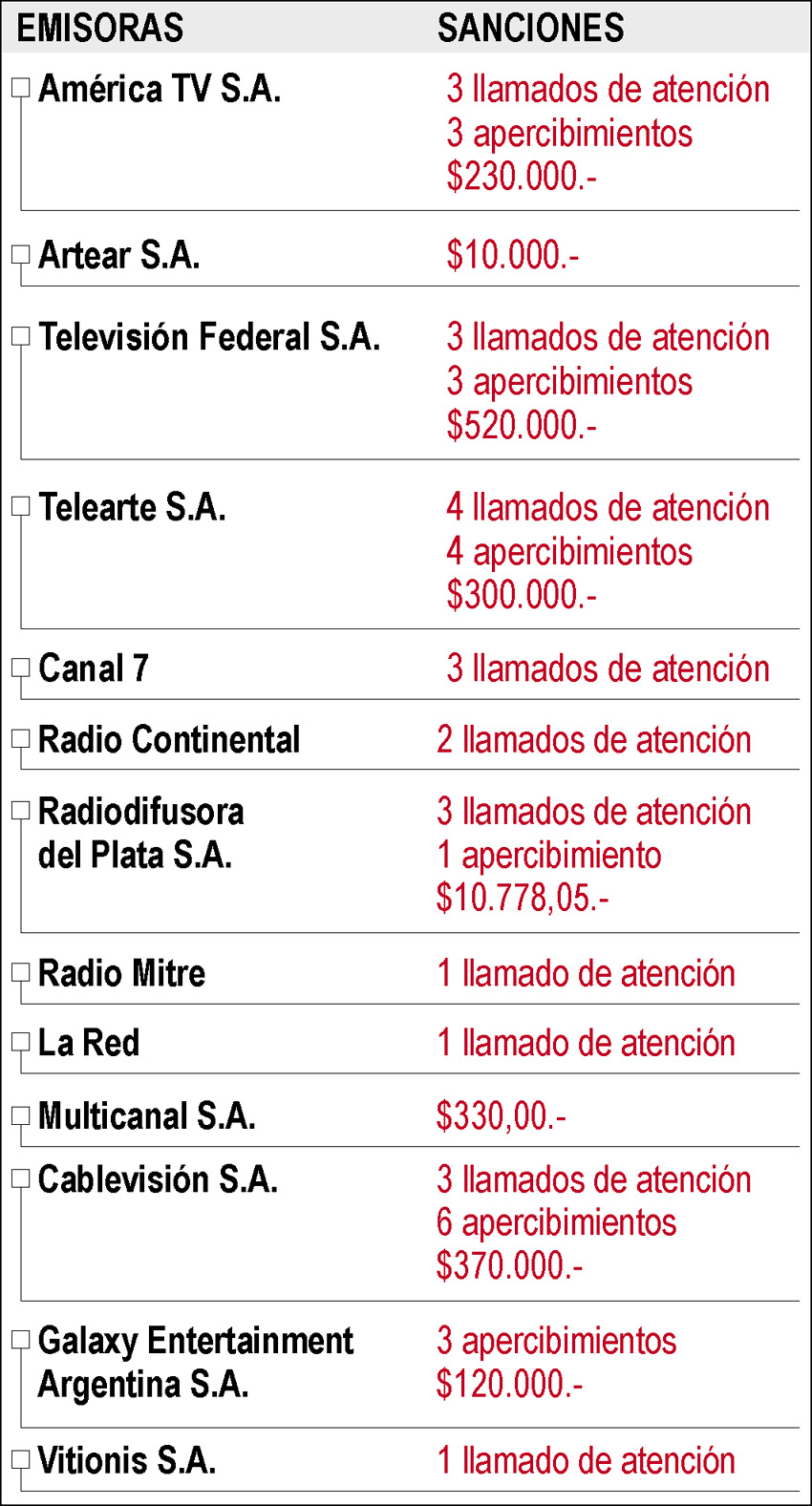 n el marco de la nueva estrategia para dar a conocer los actos de gobierno, el Comité Federal de Radiodifusión difundió el pasado 10 de octubre un nómina de medios que sufrieron sanciones a sus programas de radio y televisión por haber violado las normas de contenidos. Se trata de una especie de contraofensiva estatal tendiente a neutralizar las acusaciones de los privados de ser un organismo “censor”, calificación que llevó adelante el conductor Jorge Rial luego de las multas que recayeron a su programa, “Intrusos en el Espectáculo”. Por eso ahora, Gustavo López aprovechó la base de una política de transparencia que envuelve a los funcionarios y aseguró en un comunicado de prensa que “en una sociedad democrática y con las instituciones de la República funcionando plenamente, la aplicación de la ley jamás puede ser considerada un acto de censura”. De esta manera, Telefé encabeza la lista de canales más multados con la suma de 520 mil pesos, seguido por Azul Televisión, con 300 mil, América, que alcanza los 230 mil y Artear, con la magra multa de 10 mil. Estas empresas, que recibieron las mayores sanciones, no sólo deberán pagar sus infracciones en efectivo sino que además tendrán que sumar una serie de apercibimientos. Asimismo, el organismo informó que Canal 7, Radio Continental, Radiodifusora del Plata y Radio Mitre también están en la lista de infractores de la Ley de Radiodifusión y de la Guía de Contenidos, el documento consensuado el año pasado por el Comfer y las empresas radiodifusoras para establecer un acuerdo mínimo sobre programación hasta tanto no se actualice la ley vigente. Al cruce de las críticas En su respuesta a los medios, Gustavo López adujo que “a partir de la implementación de esta metodología que supone la aplicación de sanciones a quienes hayan incumplido el Horario de Protección al Menor acordado a través de la Guía de Contenidos para la TV y darla a conocer, hemos recibido críticas de varios programas sancionados por la supuesta aplicación de la Ley de la dictadura, una supuesta acción de censura y una aparente discriminación por falta de sanciones similares a otros infractores”.